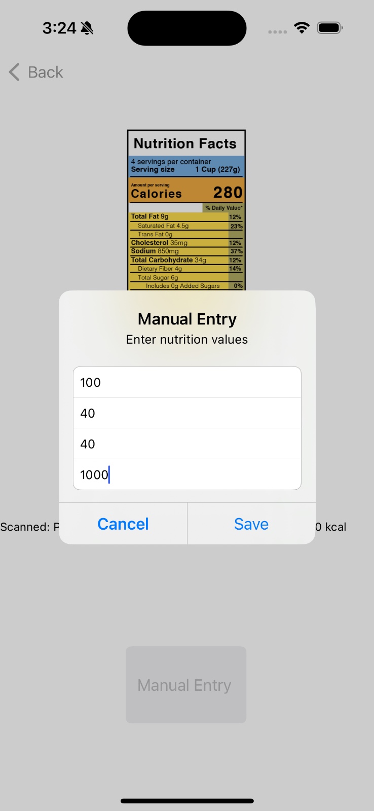 Manual Entry: When OCR fails (and it will), users can manually enter data. I created an alert with four text fields for protein, fat, sugar, and calories. The validation ensures users enter valid numbers, and it saves directly to CoreData. It's a simple fallback, but it makes the app usable even when OCR fails.
