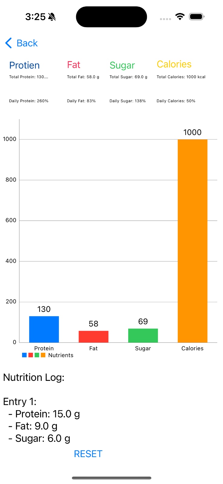 Bar Chart Visualization: The chart displays total protein, fat, sugar, and calories as colored bars. Each nutrient gets its own color (blue, red, green, orange) for easy distinction. The chart animates when data updates, which is satisfying to watch. It's the little things that make an app feel polished.